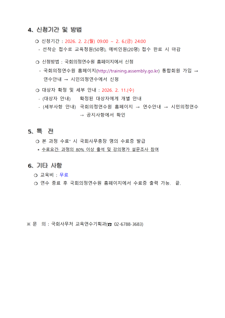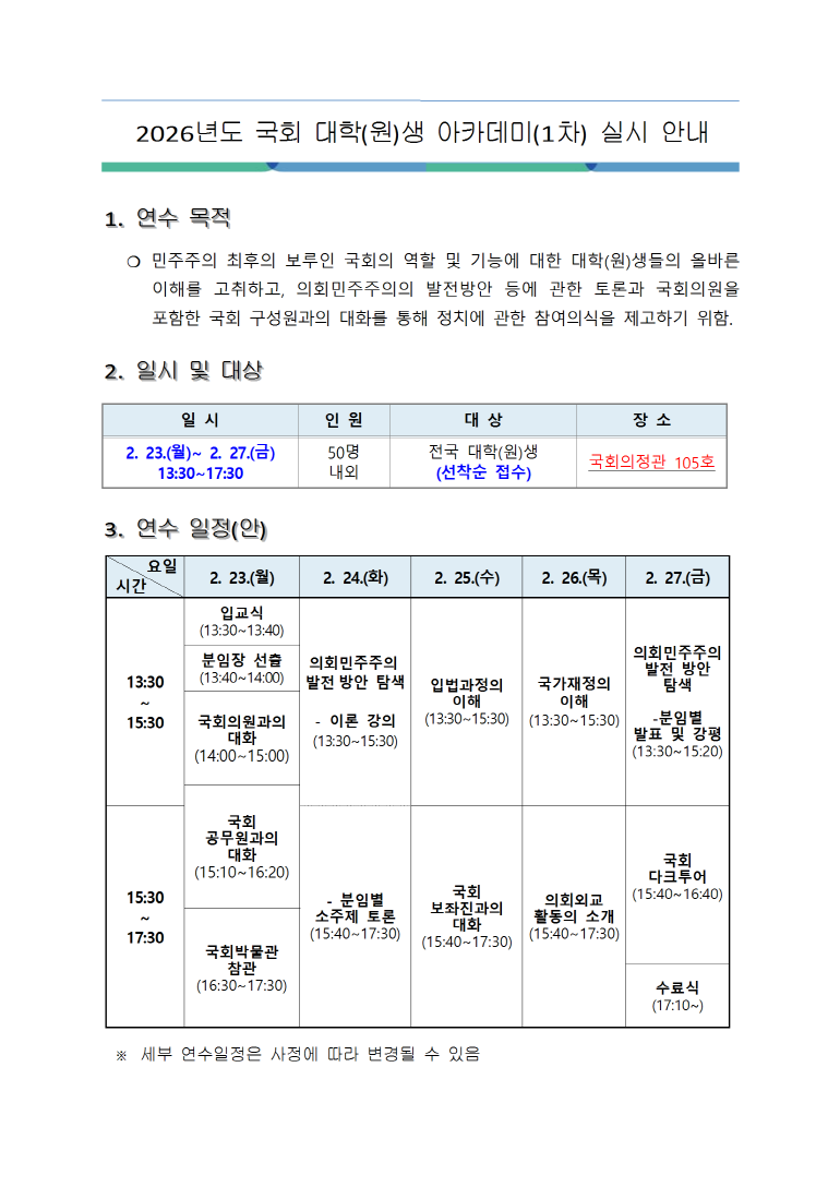 [프로그램] 2026년도 국회 대학(원)생 아카데미(1차) 실시 안내